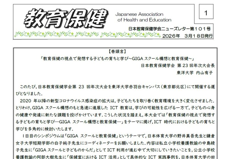 日本教育保健学会ニューズレター101号(ダイジェスト版)をアップしました